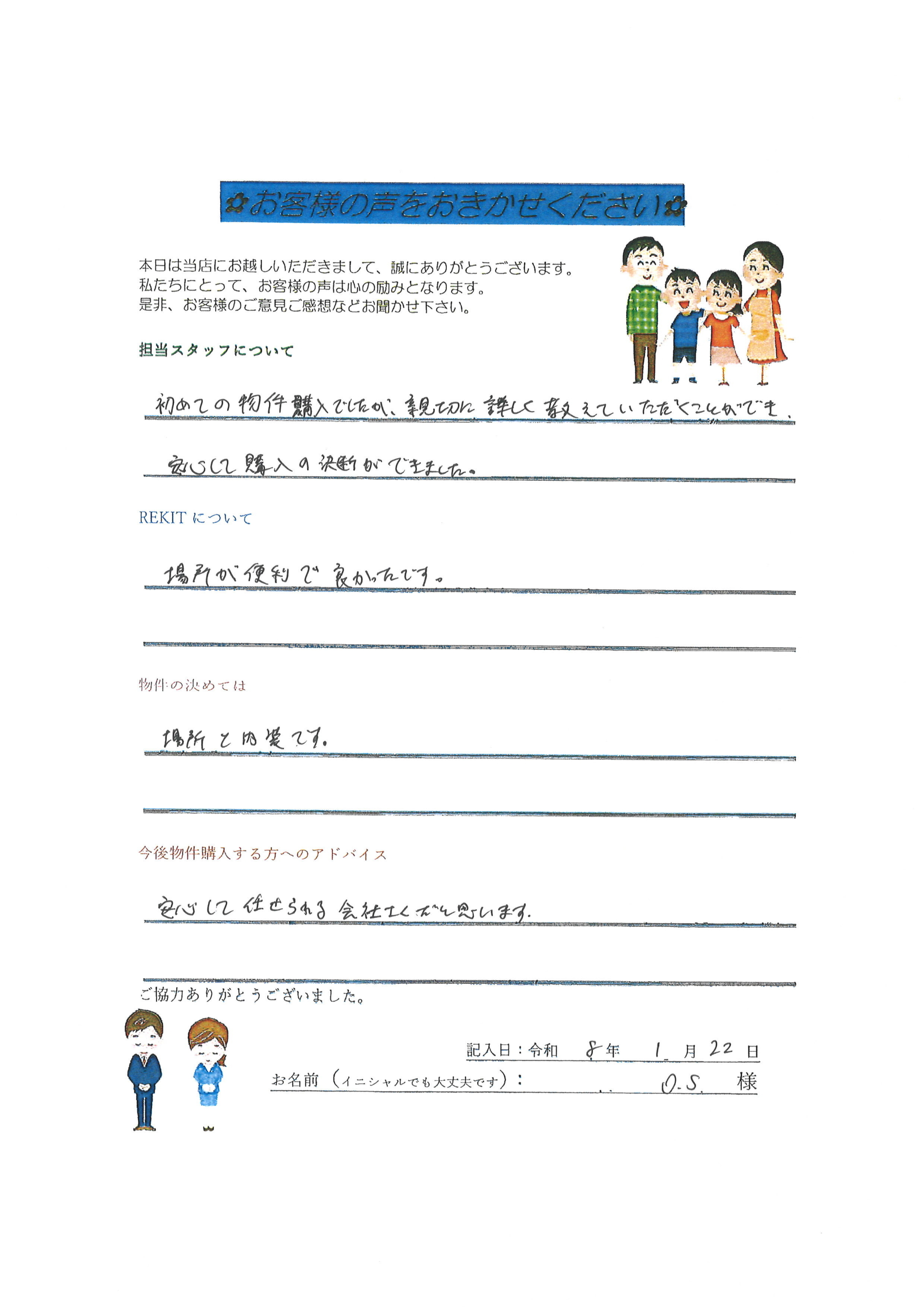 お客様の声 当店をご利用いただきまして誠にありがとうございました。 お客様より温かいお声は、 私たちにとって何よりの喜びです。 今後も信頼頂ける不動産会社を目指して参ります。 新着R7年12月24日更新! 令和7年6月28日 お客様の声頂きました! 令和7年7月7月18日 お客様の声頂きました☻ 令和7年7月21日 お客様の声頂きました。 令和7年7月28日 お客様の声頂きました♡ 令和7年8月2日 お客様の声頂きました! 令和7年9月13日 お客様の声頂きました!! 令和7年10月19日 お客様の声頂きました! 令和7年10月30日 お客様の声頂きました‼ R7年12月24日 お客様の声頂きました❣ R8年1月22日 お客様の声頂きました★